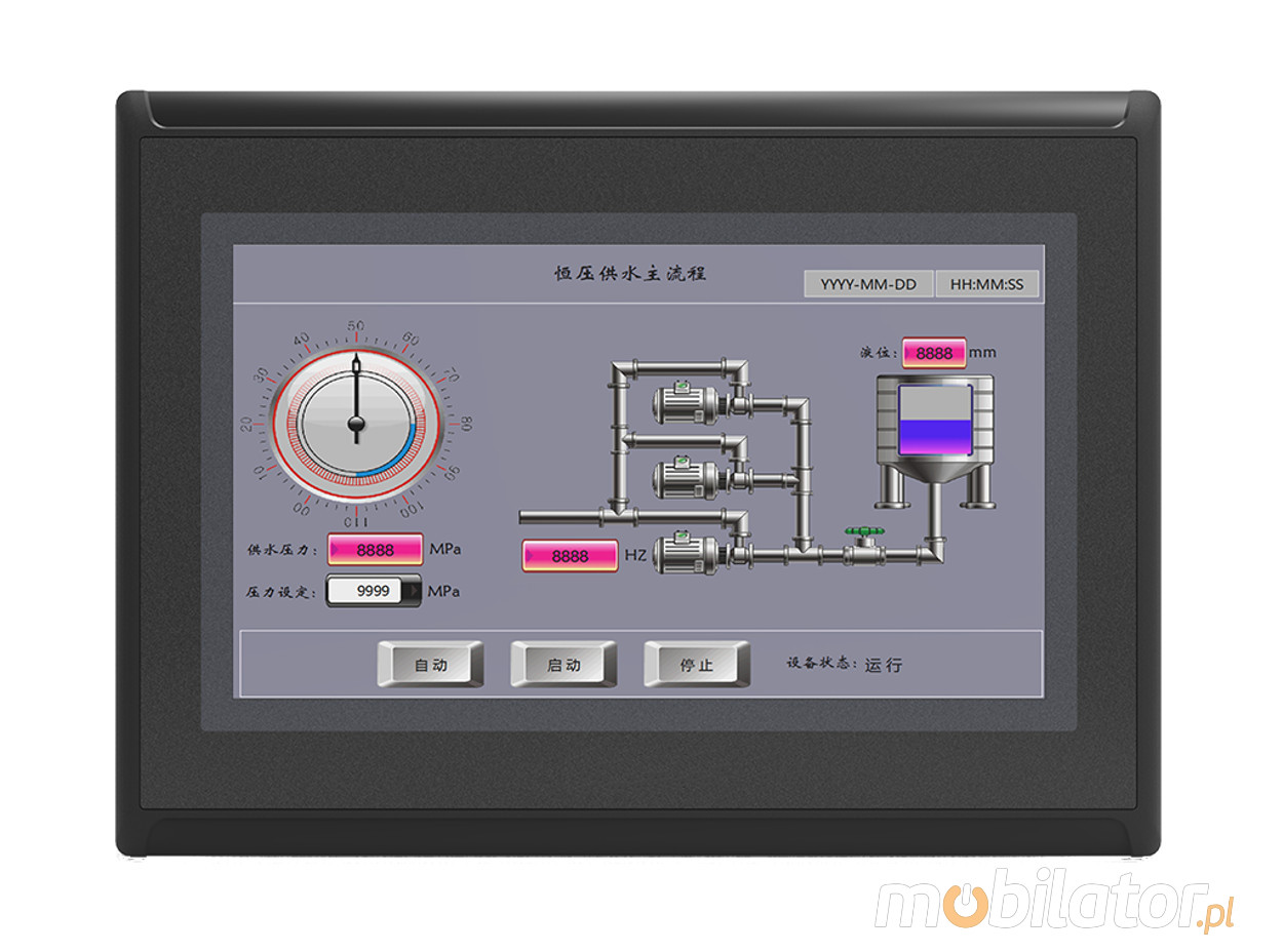 Obudowa HMI została wykonana ze specjalistycznej mieszanki PC/ABS (Poliwęglan/akrylonitrylo-butadienowo-styren) zapewniając urządzeniu bardzo dużą odporność na uszkodzenia mechaniczne. Dzięki takiej konstrukcji jest on w każdej chwili gotowy do eksploatacji nawet w ekstremalnych warunkach, takich jak upał, zimno czy wibracje. Dodatkowo przedni panel urządzenia posiada międzynarodową normę IP65, co potwierdza odporność na wodę i całkowią ochronę przed pyłem.