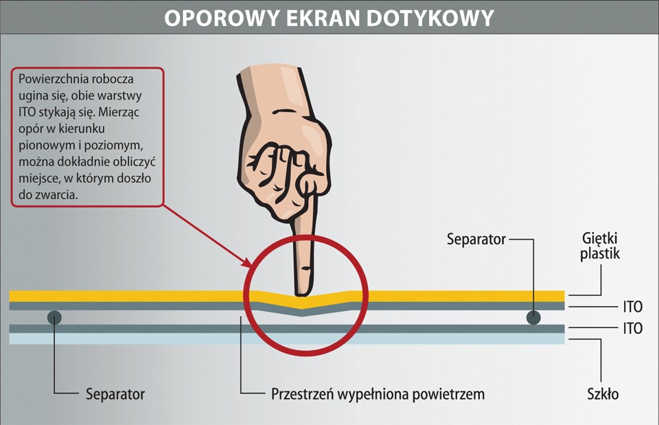 W ekranie rezystywnym powierzchnia czuła na dotyk zbudowana jest z dwóch plastikowych płytek. Płytka na powierzchni wykonana jest z cienkiego i odpornego na zadrapania plastiku. Pokryta jest także cienką warstwą materiałów przewodzących umieszczonych na spodzie “szybki”. Pod górną szybką (czyli poniżej materiału przewodzącego) znajduje się druga plastikowa płytka. Obydwie płytki nie mają ze sobą kontaktu aż do momentu, gdy użytkownik urządzenia nie wciśnie ekranu palcem lub rysikiem. Następuje wtedy kontakt pomiędzy oddalonymi od siebie nieznacznie ekranami. W wyniku ich zetknięcia powstaje zwarcie, które dzięki zmierzeniu oporów pionowego i poziomego zamieniane jest na dane wskazujące procesorowi miejsce styku.