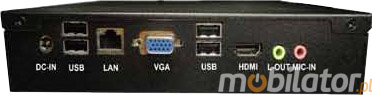 Zintegrowana karta sieciowa - Intel RTL8111E-VL umożliwiaja podłączenie urządzenia do sieci. Komputer wyposażony jest w: jedno złącze LAN, jeden port COM(RS232), jeden port HDMI, jedno wyjście VGA, cztery porty USB 2.0, dwa porty USB 3.0,jedno wejście Audio.