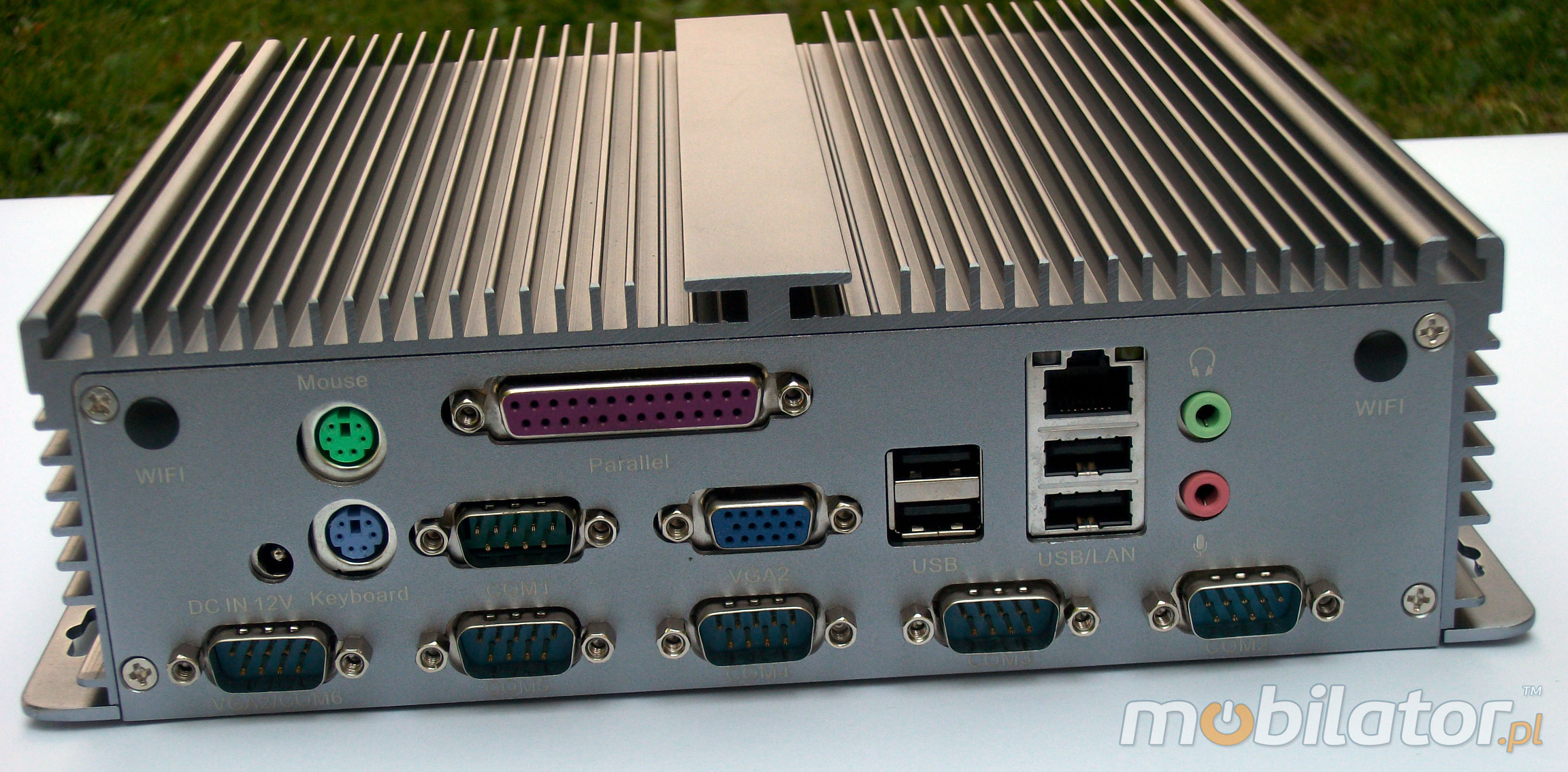 Zintegrowana karta sieciowa - Intel RTL8105E 100M Lan (opcjonalnie moduł WiFi) umożliwiaja podłączenie urządzenia do sieci. Komputer wyposażony jest w: jedno złącze LAN, sześć portów COM(RS232) - opjonalnie dwa porty COM mogą zostać wymienione na COM(RS422/485), dwa porty PS/2, jeden port LPT, jedno wyjście VGA, osiem portów USB 2.0, jedno wejście Audio, jedno wejście mikrofonowe oraz złącza/konektory wbudowane na płycie głównej: cztery porty USB 2.0, dwa wyjścia PowerOUT, jedno wyjście Audio, jedno złącze CPUFAN, jedno złącze SIM, jedno złącze HDMI, jedno złącze JVGA, jedno złącze LVDS, jedno złącze GPIO.