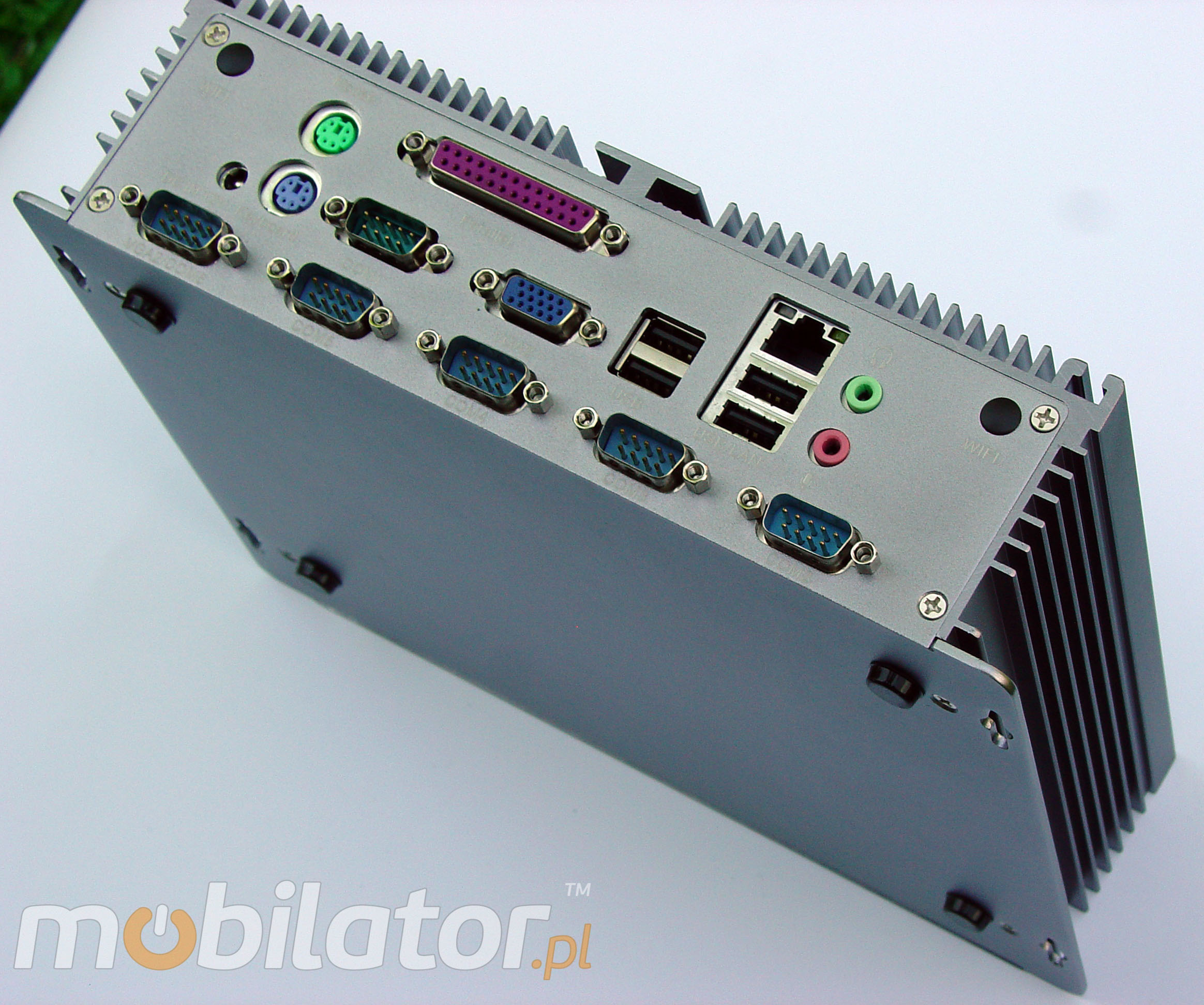Zintegrowana karta sieciowa - Intel RTL8105E 100M Lan (opcjonalnie moduł WiFi) umożliwiaja podłączenie urządzenia do sieci. Komputer wyposażony jest w: jedno złącze LAN, sześć portów COM(RS232) - opjonalnie dwa porty COM mogą zostać wymienione na COM(RS422/485), dwa porty PS/2, jeden port LPT, jedno wyjście VGA, osiem portów USB 2.0, jedno wejście Audio, jedno wejście mikrofonowe oraz złącza/konektory wbudowane na płycie głównej: cztery porty USB 2.0, dwa wyjścia PowerOUT, jedno wyjście Audio, jedno złącze CPUFAN, jedno złącze SIM, jedno złącze HDMI, jedno złącze JVGA, jedno złącze LVDS, jedno złącze GPIO.