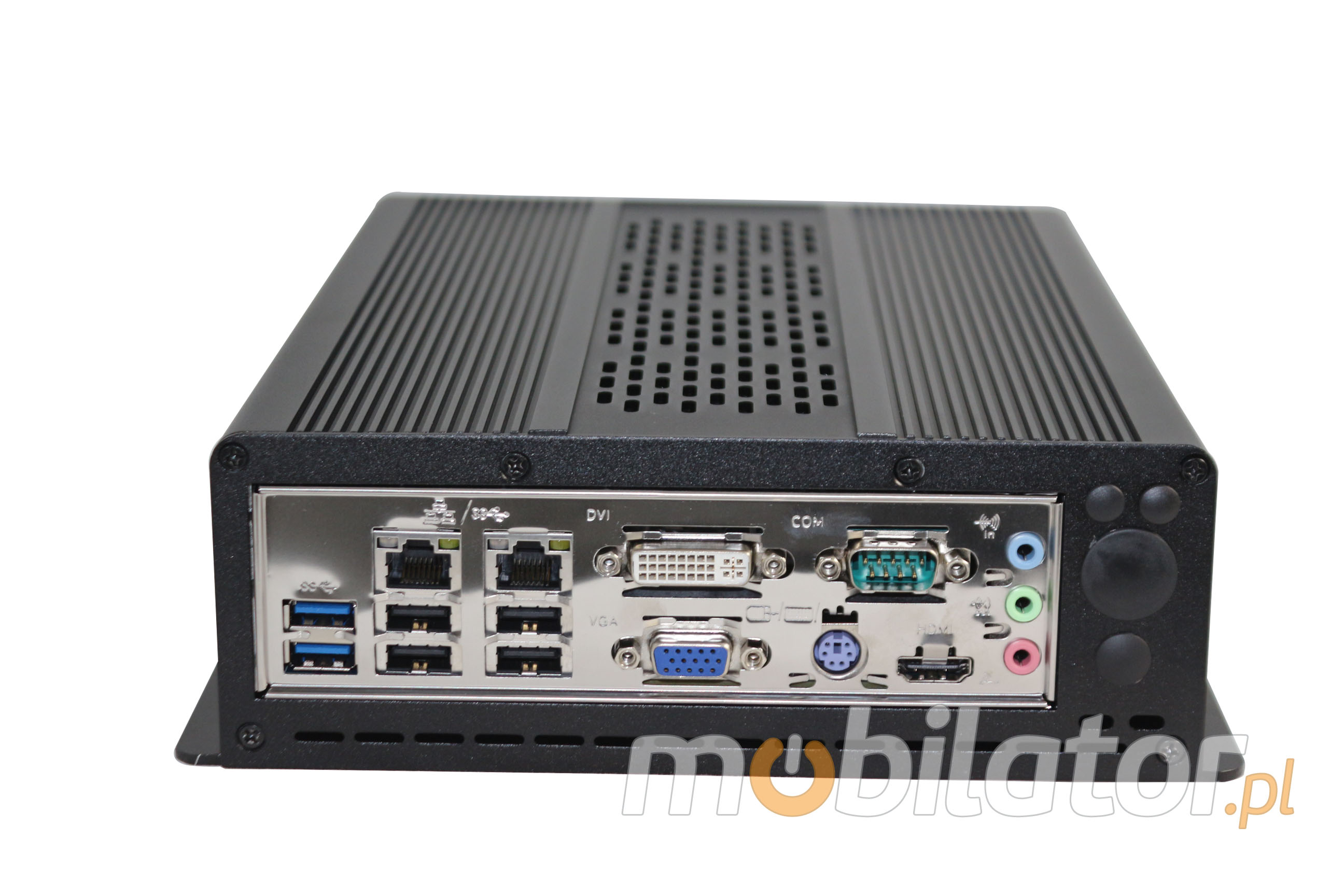 Zintegrowana karta sieciowa - Intel RTL8111E 1000M Lan (opcjonalnie moduł WiFi) umożliwiaja podłączenie urządzenia do sieci. Komputer wyposażony jest w: dwa złącza LAN, sześć portów COM(RS232), jedno wyjście DVI, jedno wyjście VGA, jedno wyjście HDMI, sześć portów USB 2.0, dwa porty USB 3.0, dwa wyjścia Audio, dwa wejścia mikrofonowe oraz złącza/konektory wbudowane na płycie głównej: dwa wyjścia PowerOUT, cztery złącza USB2.0, jedno złącze CPUFAN, jedno złącze JVGA, jedno złącze LVDS.