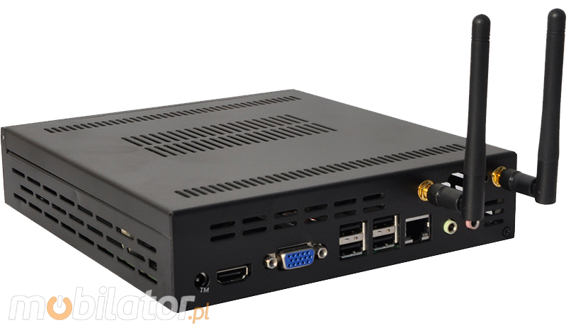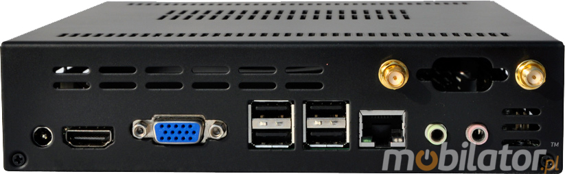 Zintegrowana karta sieciowa - Intel RTL8111DL 100M Lan (opcjonalnie moduł WiFi) umożliwiaja podłączenie urządzenia do sieci. Komputer wyposażony jest w: jedno złącze LAN, cztery porty USB 2.0, jedno wyjście HDMI, jedno wyjście VGA, jedno wejście Audio, jedno wejście mikrofonowe.