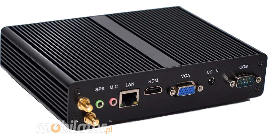 Zintegrowana karta sieciowa - Intel RTL8111DL 100M Lan oraz moduł WiFi umożliwiaja podłączenie urządzenia do sieci. Komputer wyposażony jest w: jedno złącze LAN, jeden port USB 3.0, jedno wyjście VGA, cztery porty USB 2.0, jedno wyjście HDMI, dwa porty COM(RS232), jedno wejście Audio, jedno wejście mikrofonowe.