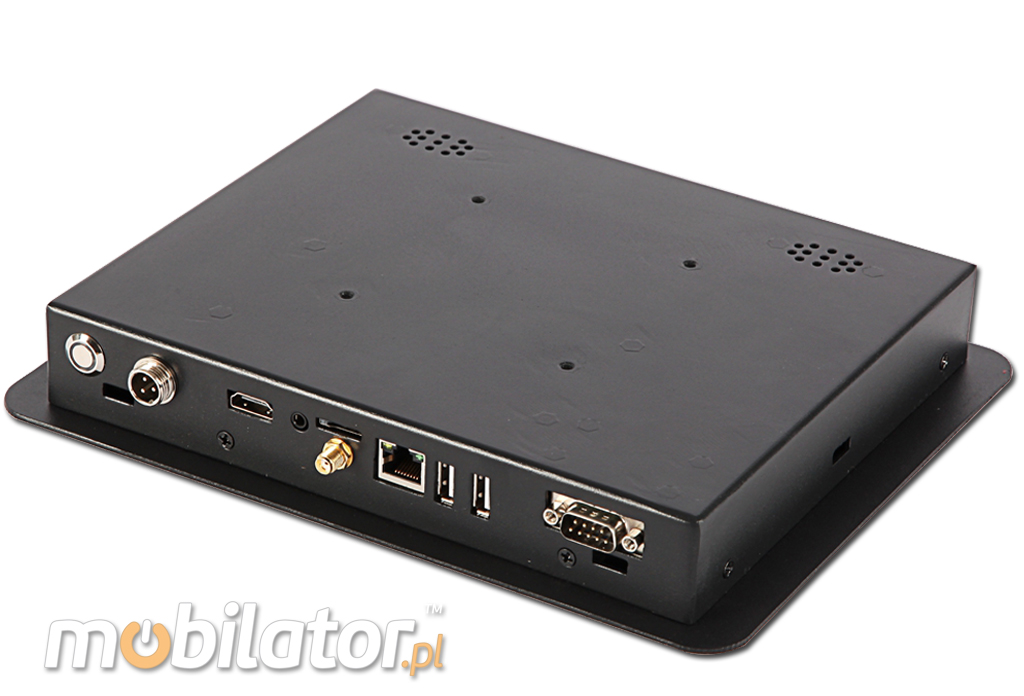Zintegrowana karta sieciowa 10/100Mpbs LAN 1xRJ-45, WIFI umożliwia podłączenie urządzenia do sieci. Panel wyposażony jest w: jedno złącze LAN, w jeden port COM(RS232), jedno wyjście HDMI, dwa porty USB 2.0, jedno wejście Audio (Eerjack), czytnik kart SD oraz złącze zasilania.