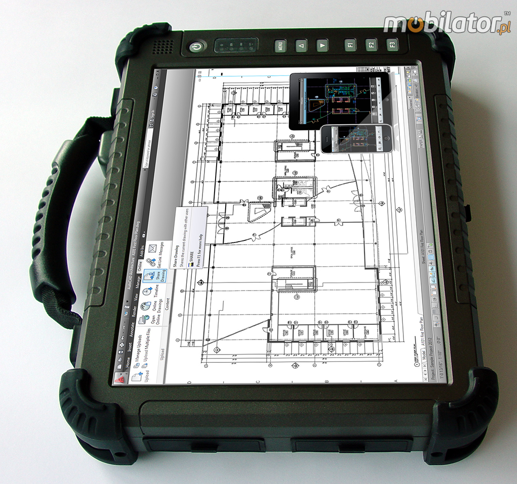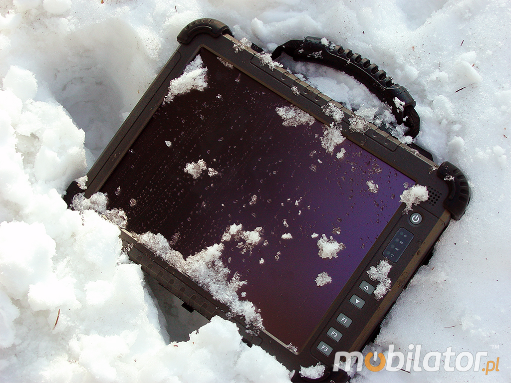 Ten niewielkich rozmiarów (323x244x59mm) tablet zadziała tam gdzie inny sprzęt dawno odmówiłby posłuszeństwa. Dzięki szczelnej obudowie wykonanej ze stopu magnezu, dodatkowym gumowym narożnikom oraz gumowym zabezpieczeniom portów, komputer jest bardzo odporny na uszkodzenia mechaniczne, brud, kurz czy wilgoć i potrafi pracować w temperaturach od -20 do 60 stopni Celsjusza. Stopień ochrony określony zostały przez normę MIL-810F.
