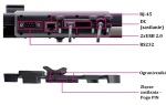 W uchwycie istnieje możliwość wykorzystania czterech złączy: 1x RS232, 1x RJ-45 oraz 2x USB 2.0, które działają po podłączeniu DC (zasilania).
