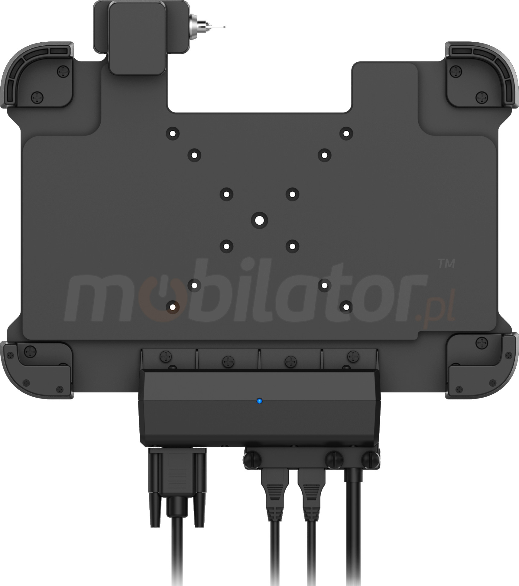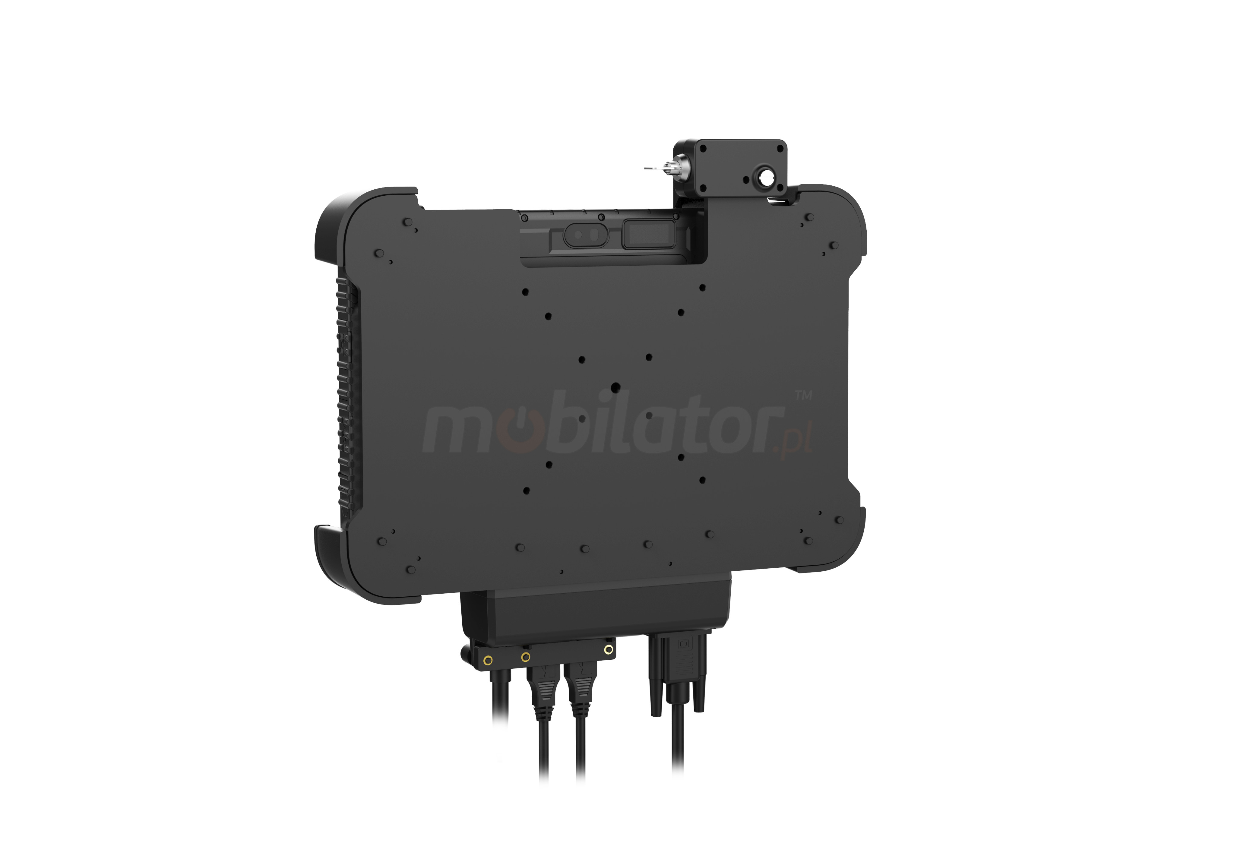 W uchwycie istnieje możliwość wykorzystania czterech złączy: 1x RS232, 1x RJ-45 oraz 2x USB 2.0, które działają po podłączeniu DC (zasilania).