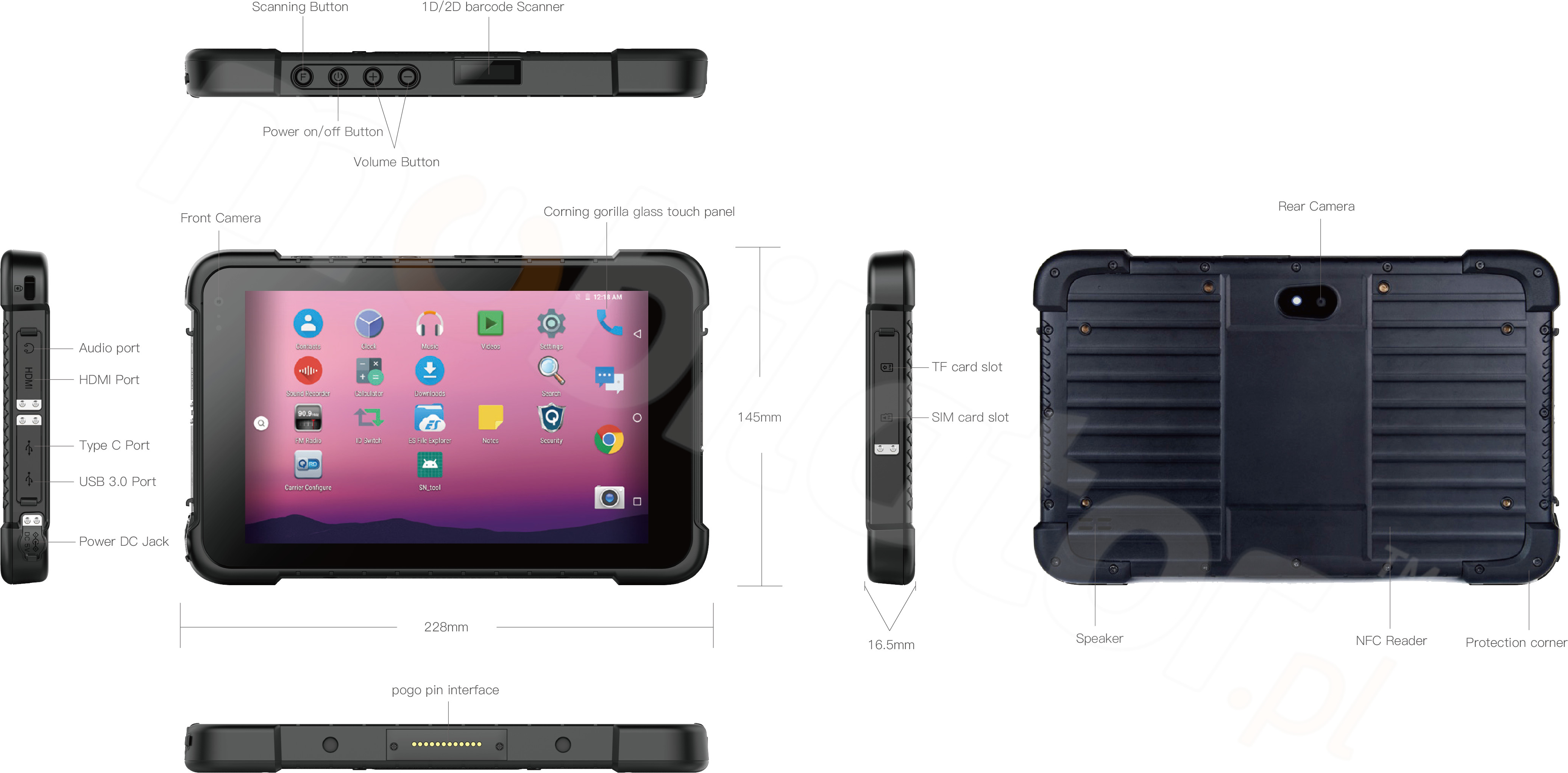 HDMI | USB 3.0 i Typ C | Audio Jack | pogopin |