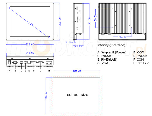 Wzmocniony Przemysłowy PanelPC QBOX 10 wyposażony jest w szereg złącz, takich jak VGA, HDMI, RJ-45, USB czy RS232. Ich rozmieszczenie w aktualnym modelu prezentuje poniższa grafika.