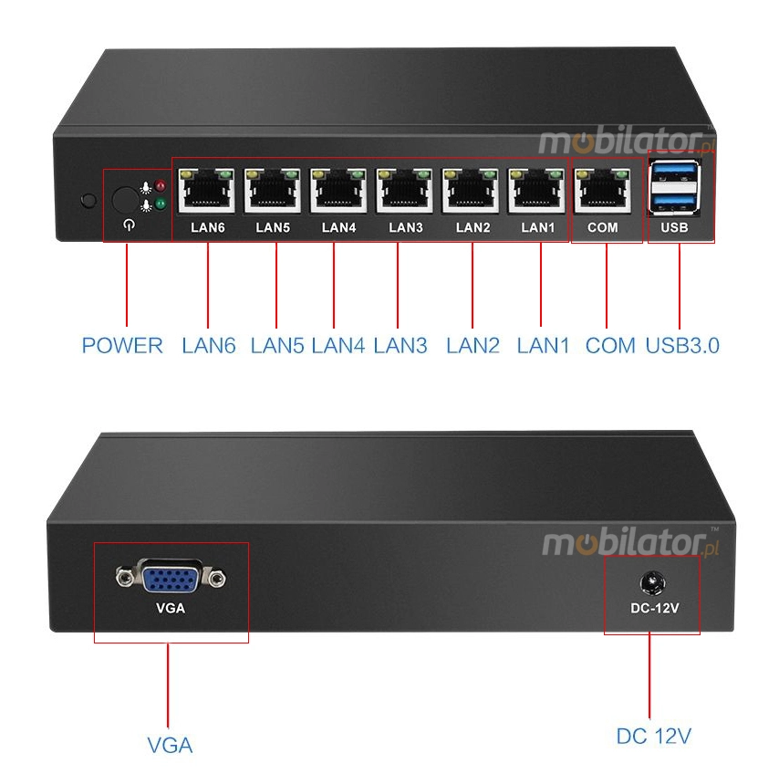 | Panel przedni | Power On/Off / 6x LAN / 2x USB 3.0 / 1x COM |