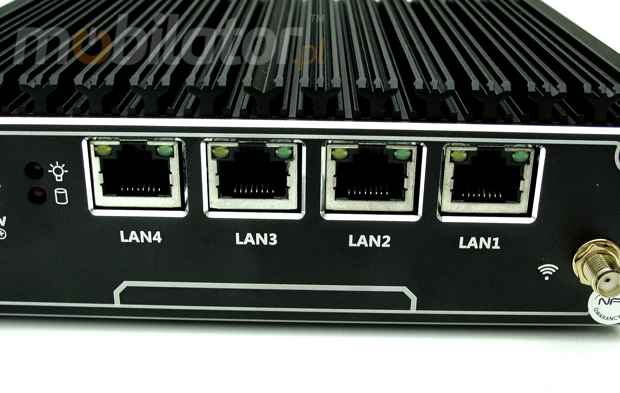 Zintegrowana karta sieciowa Intel 82583V 10/100/1000M LAN oraz moduł 4G umożliwiają podłączenie urządzenia do sieci. Komputer wyposażony jest w: cztery złącza LAN, jeden port USB 2.0, jeden port USB 3.0, jeden port COM RJ-45, jeden port VGA.